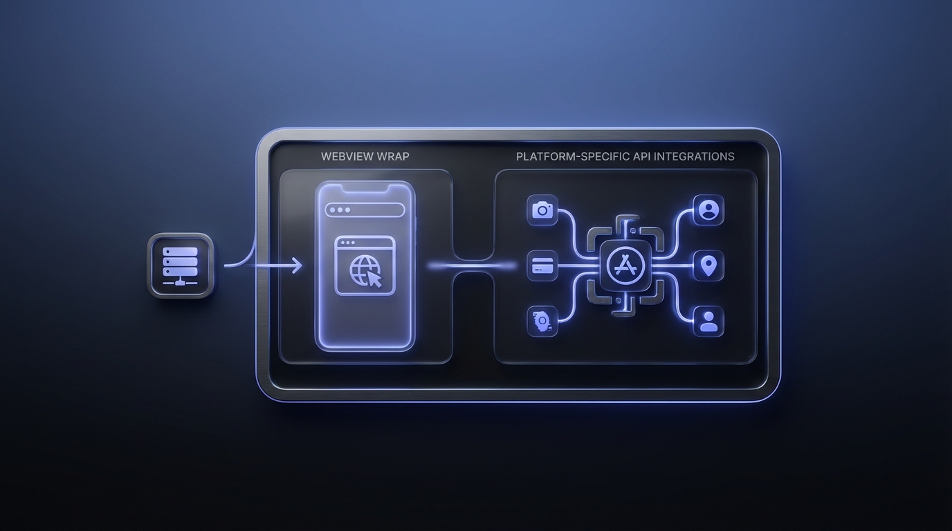 Webview apps wrap your existing website in a native shell, rendering your live site inside the app. Native integration apps rebuild your store using platform-specific APIs and require separate management. Operational differences: Webview approach (Appo, MobiLoud, Median.co):